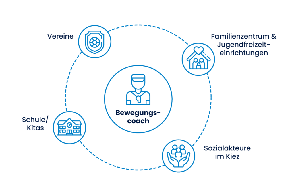 - Durchführung und Koordination von Bewegungsangeboten in Kitas, Schulen und im öffentlichen Raum
